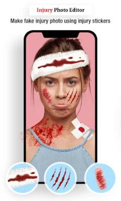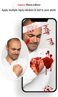 Create injuries on yourself or on your friends/family photo using this Injuries Photo editor. We created multi category injuries that are specially design to create realistic effect. 100+ injures available that fit just right on your body.